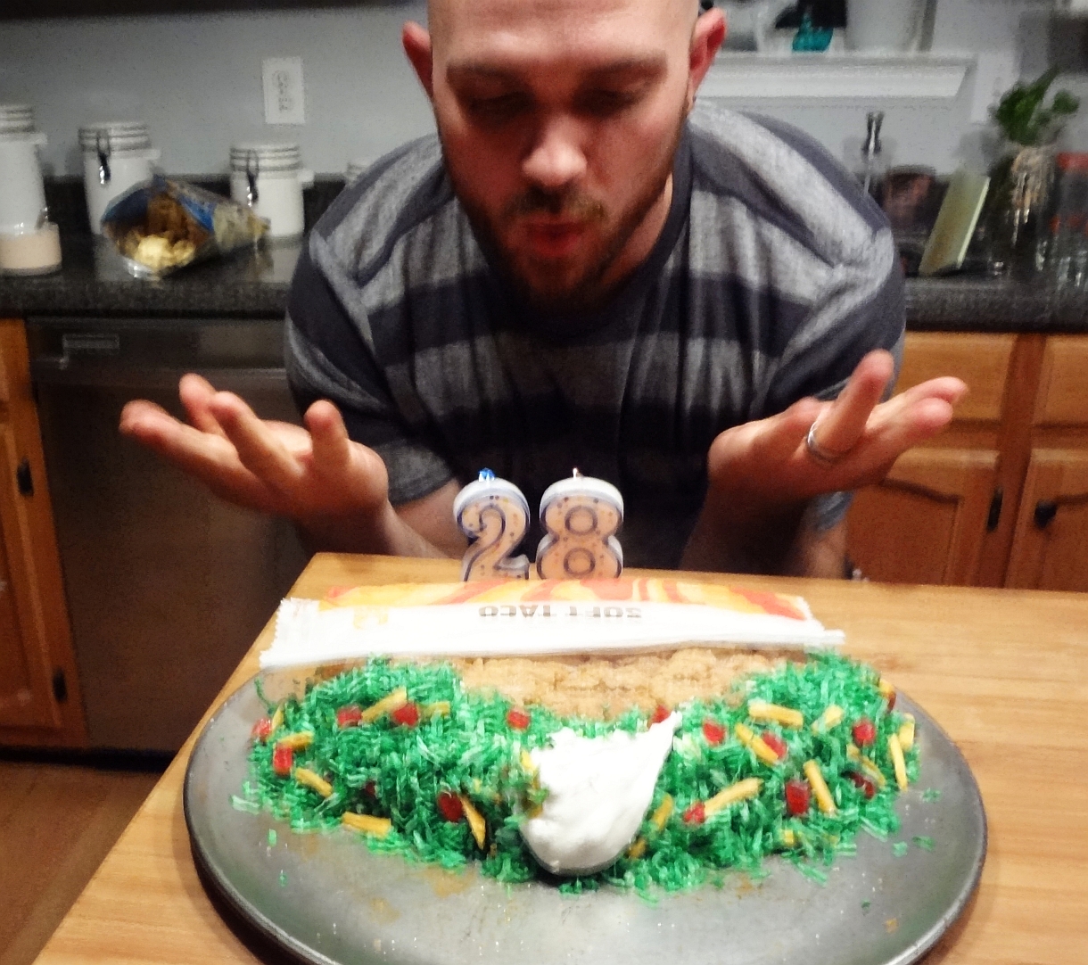 (Cake is covered with snicker-doodle cookie “tortilla”, frosting with green coconut, melted marshmallow “sour cream” , Swedish Fish parts and Star Burst shavings)